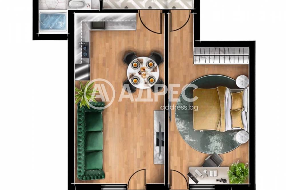 Двустаен апартамент, състоящ се от: антре, дневна с кухненски бокс, спалня и тераса от 6 кв.м. Изложението е юг.