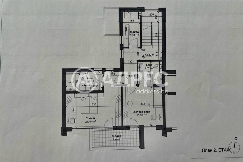 Второ ниво: две спални, две бани, тераса, коридор, мокро помещение.