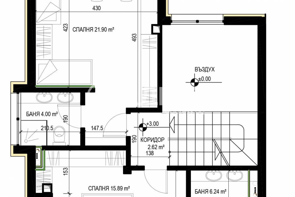 "Ниво 3" включва две просторни спални със собствени бани с wc, възможност за обособяване на трета спалня