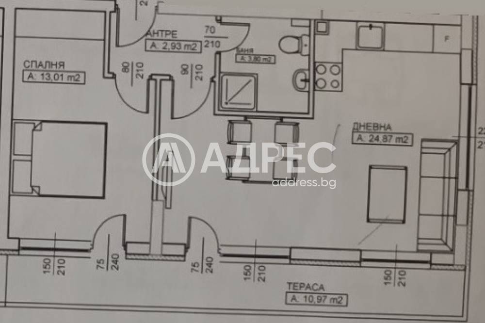 Агенция Адрес предлага на Вашето внимание двустаен апартамент в новострояща сграда в квартал Еленово за продажба. Апартаментът е с площ от 71.4 кв.м. (64.10 кв.м. чиста площ + 7.30 кв.м. общи части). Намира се на трети жилищен етаж в новострояща сграда, в която е предвиден асансьор. Състои се от входно антре, всекидневна с кухня, спалня, баня с тоалетна и тераса.