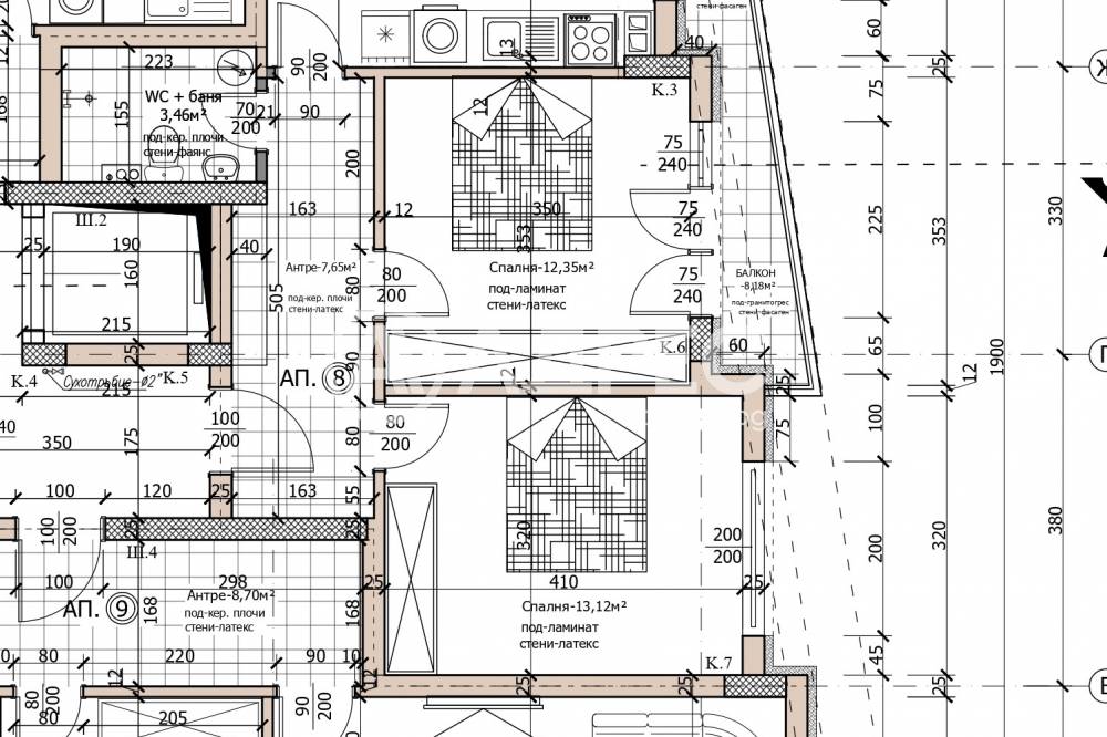 Предлаганият апартамент № 8 е ситуиран на трети жилищен етаж на кота +8,40м с чиста площ от 78,62 кв.м., /86,48 кв.м с общи части/ и има следното разположение: антре, просторна всекидневна с кухненски бокс, две спални помещения, баня с тоалетна и тераса с излаз от едната спалня и дневната.