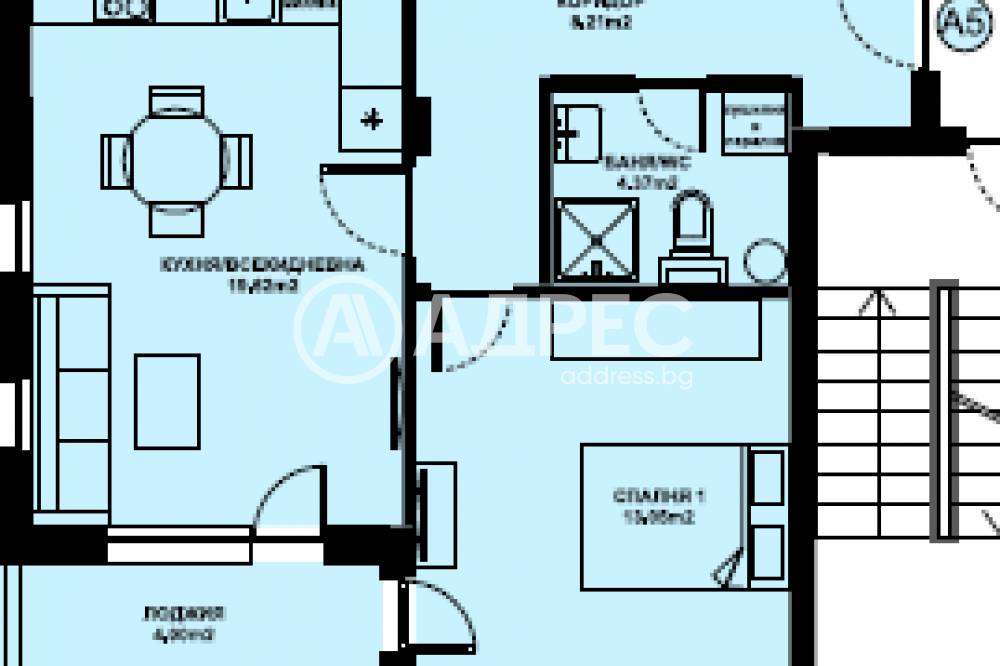 Предлаганият апартамент А5 на втори етаж с чиста площ от 58,03 кв.м / 62,75 кв.м с общи части / и има следното разположение: антре,дневна с кухненски бокс,спалня,баня с тоалетна и тераса.Към апартамента принадлежи и мазе с площ 8,04