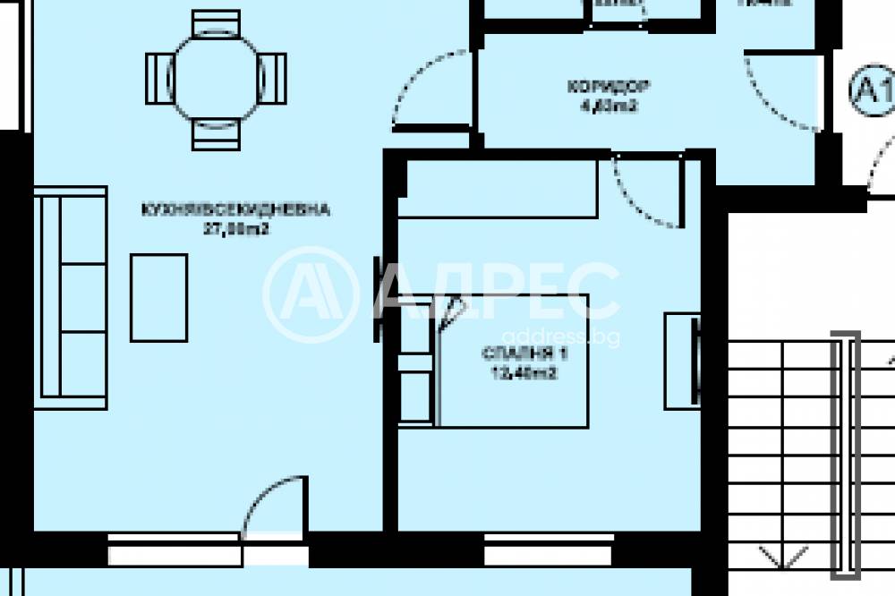 Предлаганият апартамент А1 на първи етаж с чиста площ от 65,65 кв.м / 69,51кв.м с общи части / и има следното разположение: антре,дневна с кухненски бокс,спалня,килер,баня с тоалетна и тераса. Към апартамента принадлежи и мазе.