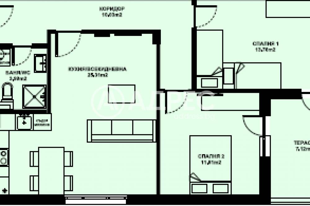 Предлаганият апартамент А4 на първи етаж с чиста площ от 83,30 кв.м / 90,08 кв.м с общи части / и има следното разположение: антре,дневна с кухненски бокс,две спални,баня с тоалетна и тераса.Към апартамента принадлежи и мазе с площ 7,27