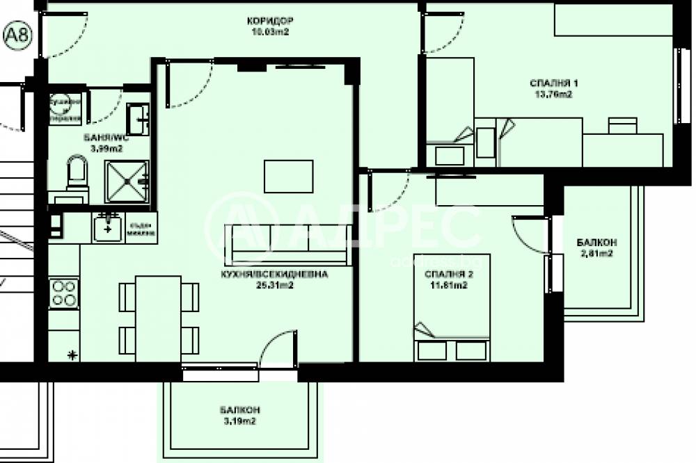 Предлаганият апартамент А8 на втори етаж с чиста площ от 82,77 кв.м / 89,51 кв.м с общи части / и има следното разположение: антре,дневна с кухненски бокс,две спални,баня с тоалетна и две тераса.Към апартамента принадлежи и мазе с площ 7,25