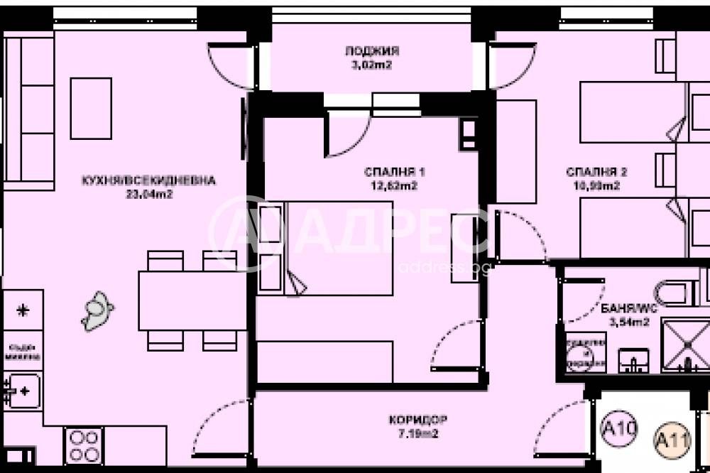 Предлаганият апартамент А10 на трети последен етаж с чиста площ от 71,05 кв.м / 76,83 кв.м с общи части / и има следното разположение: антре,дневна с кухненски бокс,две спални,баня с тоалетна и две тераса.Към апартамента принадлежи и мазе с площ 5,74