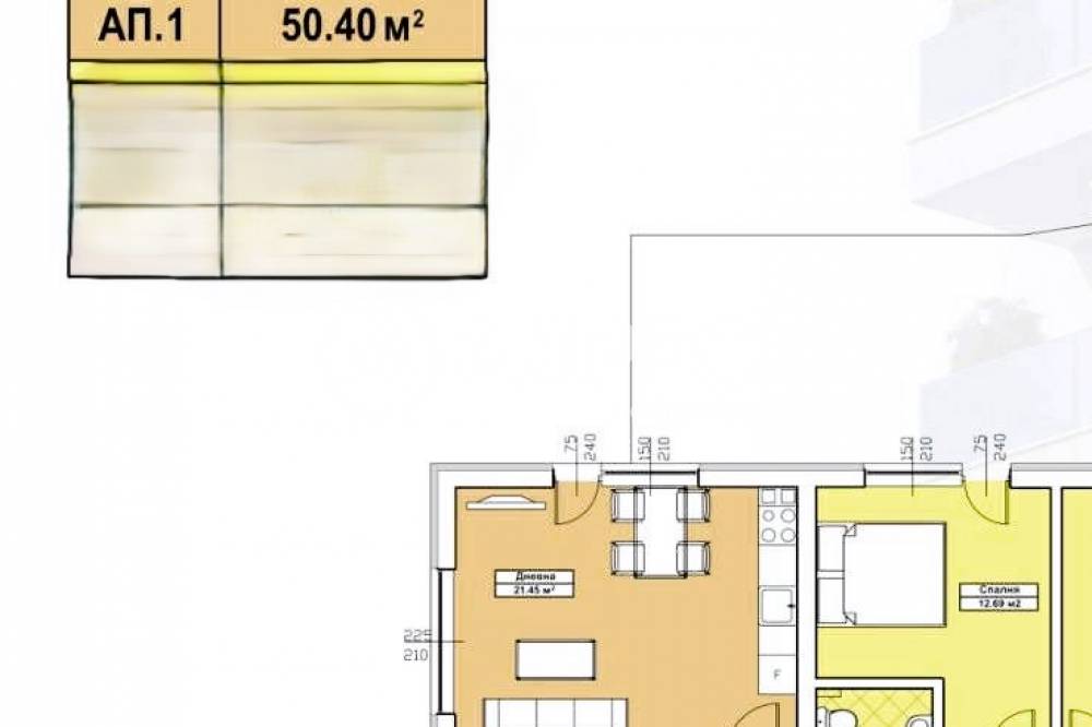 Предлаганият апартамент № 1 е ситуиран на партерен етаж с чиста площ от 50,40 кв.м /55,18 кв.м с общи части/ и има следното разположение: антре, дневна с кухненски бокс, спалня и баня с тоалетна.