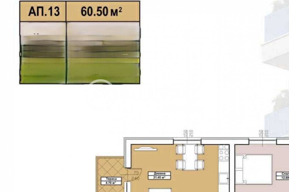 Предлаганият апартамент №13 на трети етаж с чиста площ от 60,50 кв.м /66,79 кв.м с общи части/ и има следното разположение: антре, дневна с кухненски бокс, спалня, баня с тоалетна и тераса.