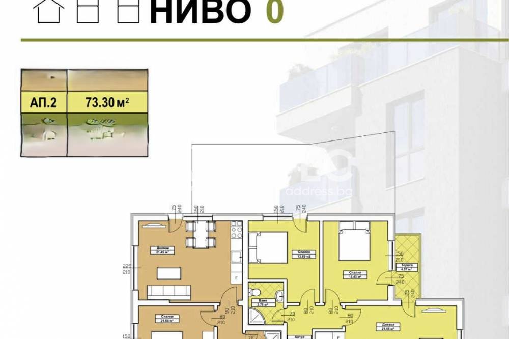 Предлаганият апартамент № 2 е ситуиран на партерен етаж с чиста площ от 73,30 кв.м /80,39 кв.м с общи части/ и има следното разположение: антре, дневна с кухненски бокс, две спални помещения, баня с тоалетна и тераса.