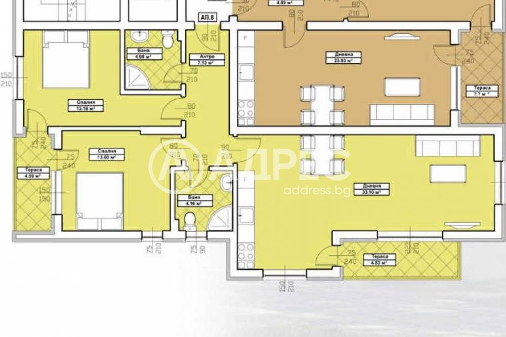 Предлаганият апартамент № 8 е ситуиран на първи етаж с чиста площ от 99,70 кв.м /110,69 кв.м с общи части/ и има следното разположение: антре, дневна с кухненски бокс, две спални помещения, две бани с тоалетни и две тераси.