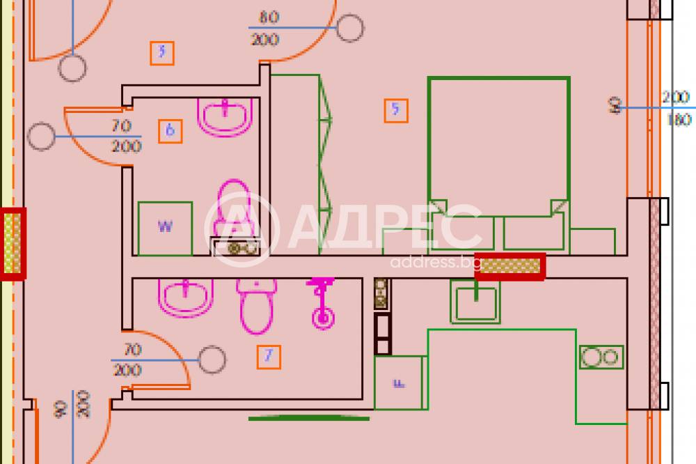 Разпределението позволява фукционално обособяване на просторна дневна с кухненски бокс,антре, две спални, баня с тоателтна,мокро помещение и тераса с приятна гледка.
