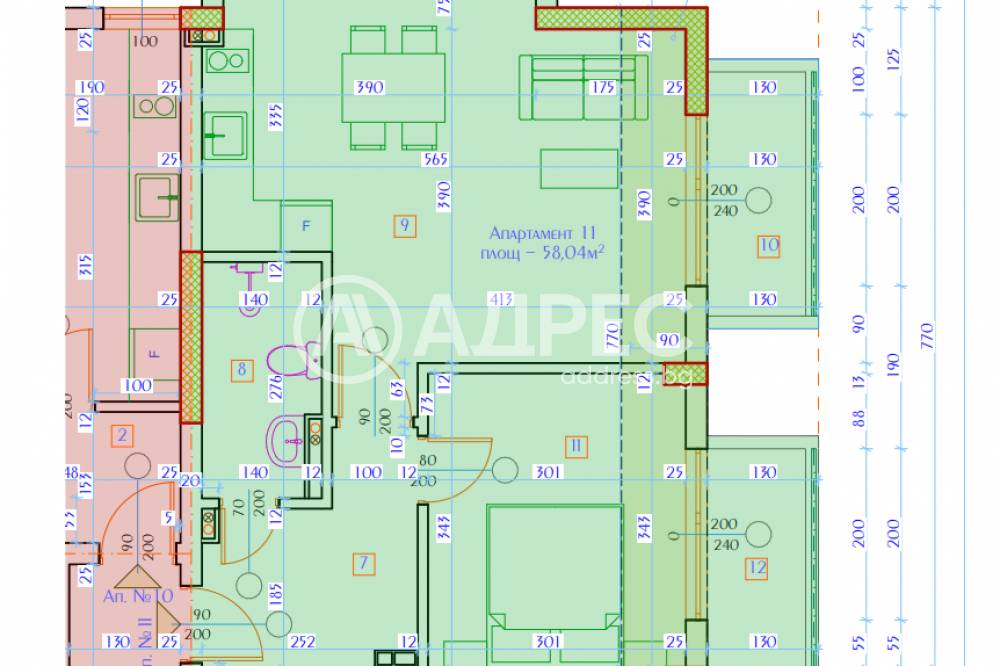 Предлаганият апартамент е № 11 на четвърти жилищен етаж с чиста площ от 58,24 кв.м/ 65,33 кв.м с общи части/ и има следното разпределение: входно антре, дневна с кухненски бокс, спалня, санитарен възел и две тераси.