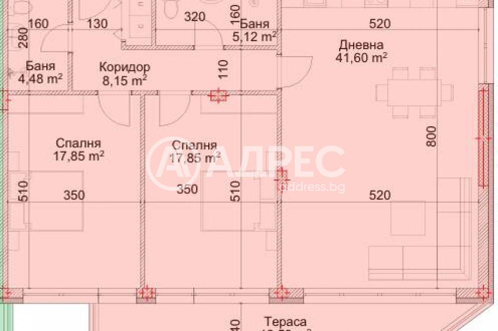 Агенция Адрес предлага на Вашето внимание тристаен апартамент в новострояща сграда в квартал Струмско за продажба. Апартаментът е с площ от 142.347 кв.м. (123.78 кв.м. чиста площ и 18.567 кв.м. общи части). Намира се на първи етаж и се състои от коридор, всекидневна с кухня, две спални, баня с тоалетна и тераса.