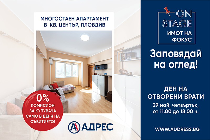 На 29 май (четвъртък), между 11:00 и 18:00 ч., в Пловдив ще се проведе първото за града издание на специалното събитие ON STAGE: Имот на фокус, от АДРЕС. Фокусът е върху два внимателно подбрани апартамента, които се отличават не само с локация и пространство, но и с характер и потенциал.