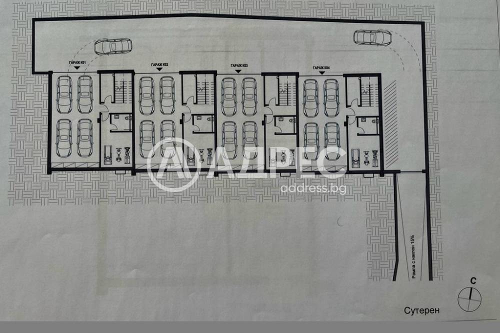Сутерен: гараж за 4 коли, коридор, фитнес, санитарно помещение, скалдово помещение.