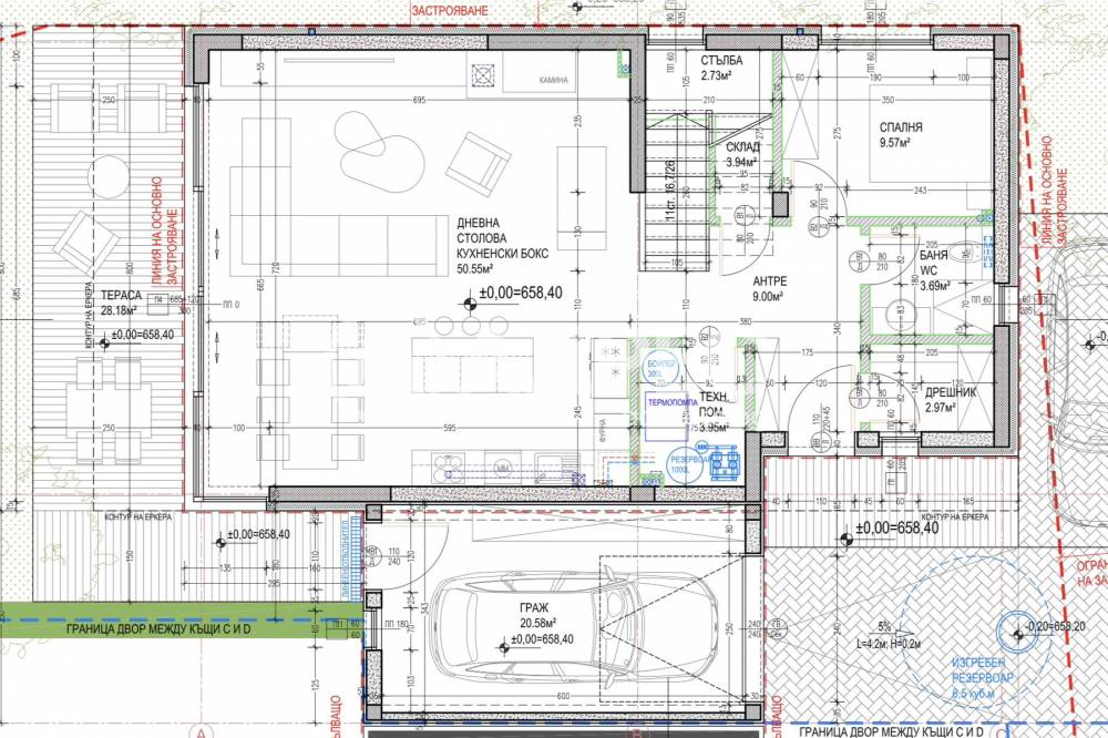 Гараж с ролетна врата с дистанционно управление.Изградена поливна система.