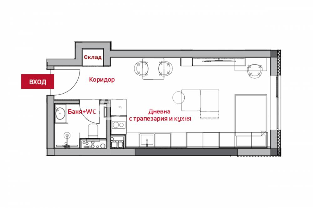 Едностаен апартамент състоящ се от входно антре с мокро помещение-склад, в което е монтирана пералня със сушилня; Съвременно обзаведена баня с тоалетна и душ пространство; Дневна зона в която са обособени кухненски бокс, трапезария , спалня с библиотека и телевизор. Кухненският бокс е с вградени уреди - хладилник, плот и микровълнова фурна, както и всичко необходимо за комфорт на живущите. Висок рейтинг в платформите за краткосрочен наем.