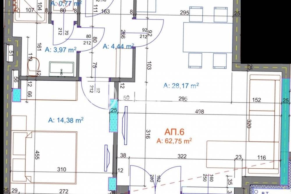 Апартамента се състои от: входно антре, хол с кухненски бокс, спалня, баня с тоалетна и тераса.