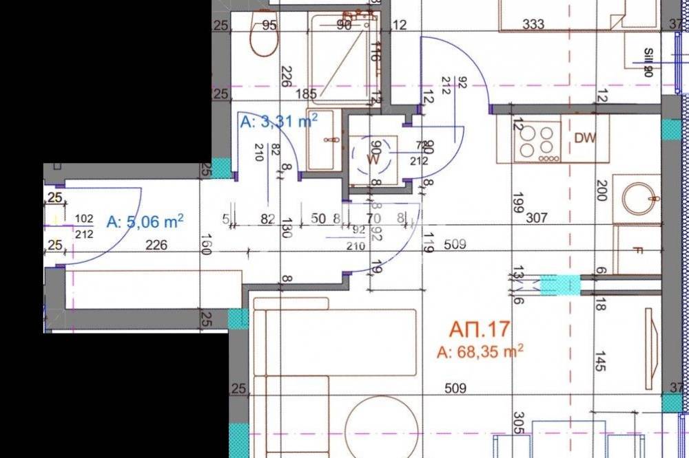 Апартамента се състои от: входно антре, хол с кухненски бокс, спалня, баня с тоалетна, мокро помещение или втора тоалетна и 2 тераси.