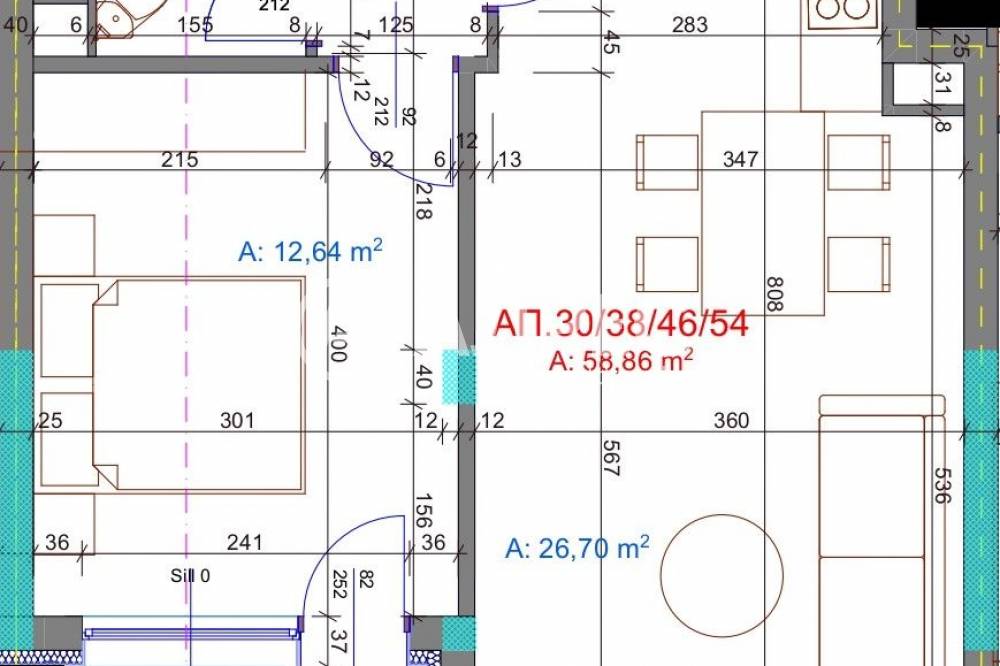 Апартамента се състои от: входно антре, хол с кухненски бокс, спалня, баня с тоалетна и тераса.