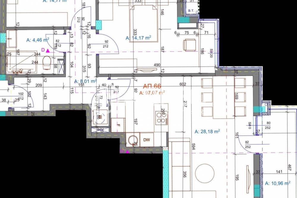 Апартамента се състои от: входно антре, хол с кухненски бокс, 2 спални, баня с тоалетна, мокро помещение или втора тоалетна и 2 тераси.