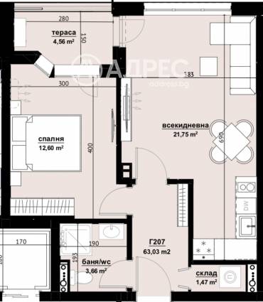 Имотът е с пллощ 63.03 кв. м., етаж 2 от 9, асансьор.