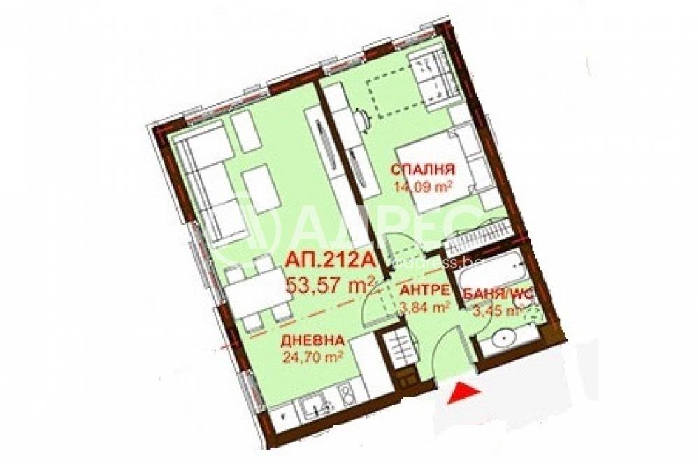 Апартаментът се състои от антре, всекидневна с трапезария и кухня, спалня, баня с wc.