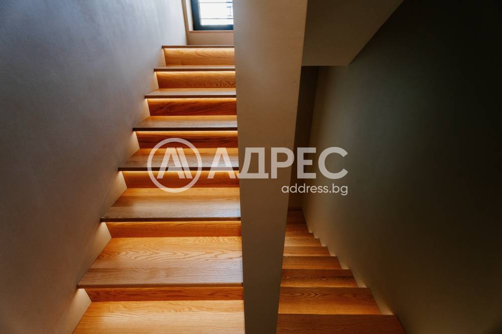 Трислоен паркет „рибена кост“ в натурален цвят и дъбови стълбища с LED осветление