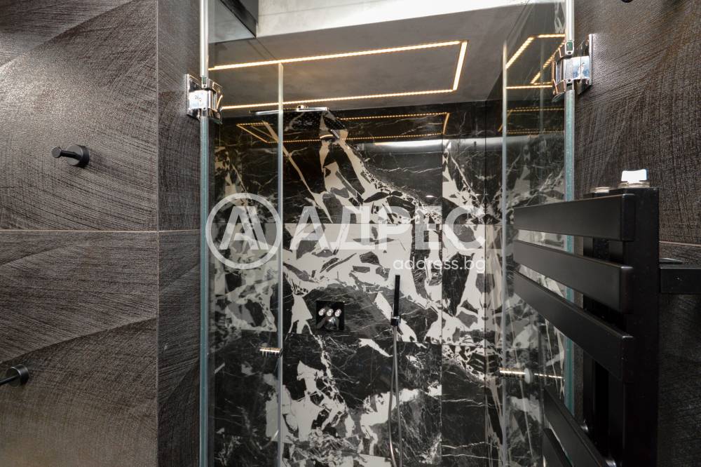 Имотът е обзаведен само с висок клас мебели и материали, разполага с подово отопление което се захранва от термопомпа, имаме конвектори във всички стаи, трислоен паркет в спалните, имаме изграде специална стъклена преграда около кухнята за изолиране на всякакви миризми при готвене.