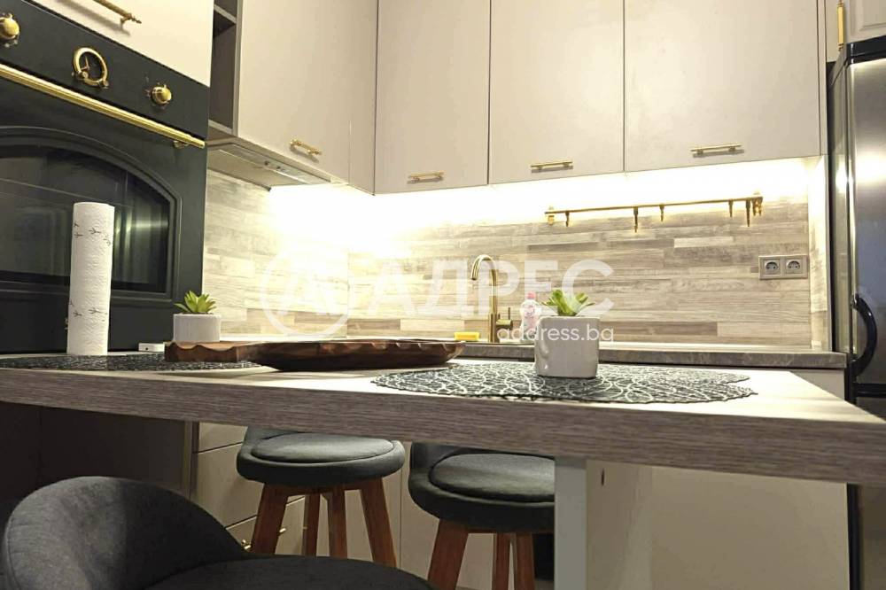 Двустаен апартамент, обзаведен с много стил и вкус, оборудван е с всички електроуреди за едно домакинство. Състои се от всекидневна с кухненска част, спалня, тераса и санитарен възел. Отоплява се с климатици. Отдава се за първи път, само дългосрочно. Не се допускат домашни любимци.