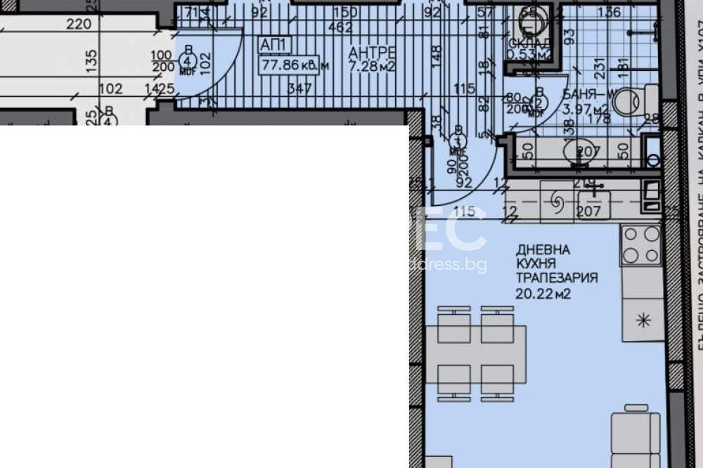 Площ на имота 94,28 кв. м., етаж 2 от 5, асансьор. Разпределение: дневна с кухненски кът с тераса, две спални, баня с тоалетна и складово помещение. Апартаментът ще бъде завършен "на тапа''.
