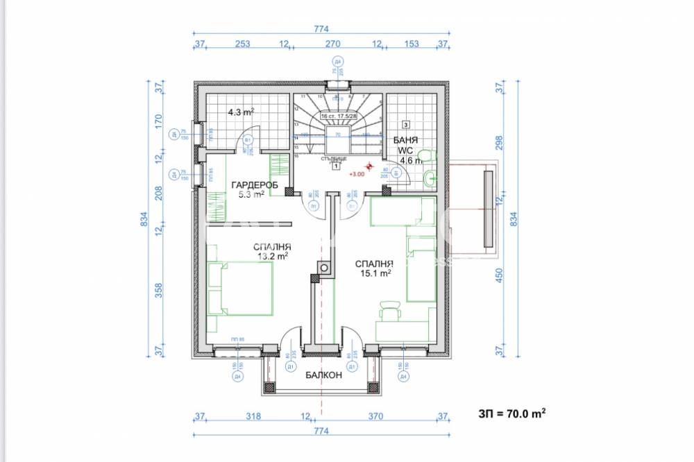 Етаж 2 (70 кв.м): Коридор, две уютни спални (едната със собствена баня, тоалетна и гардеробна), втора баня с тоалетна и балкон.