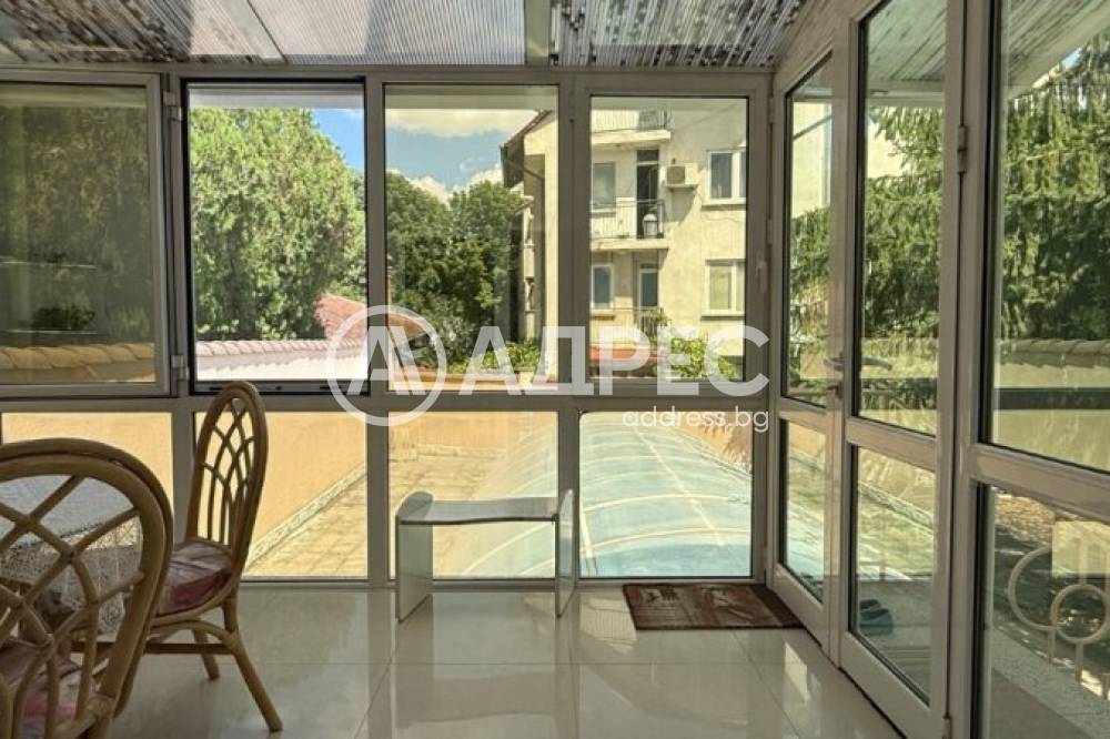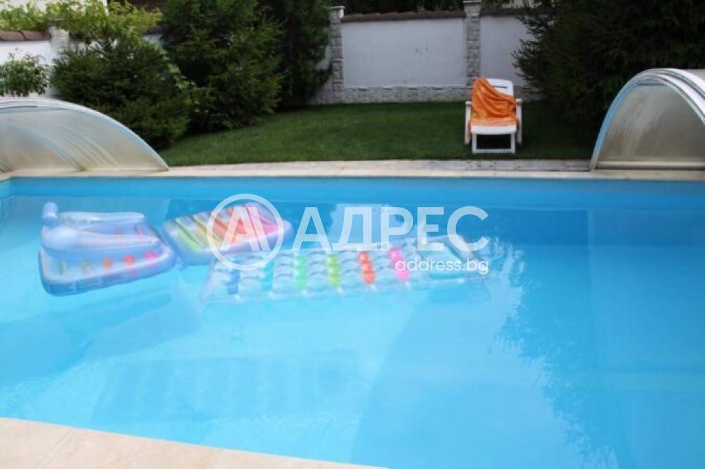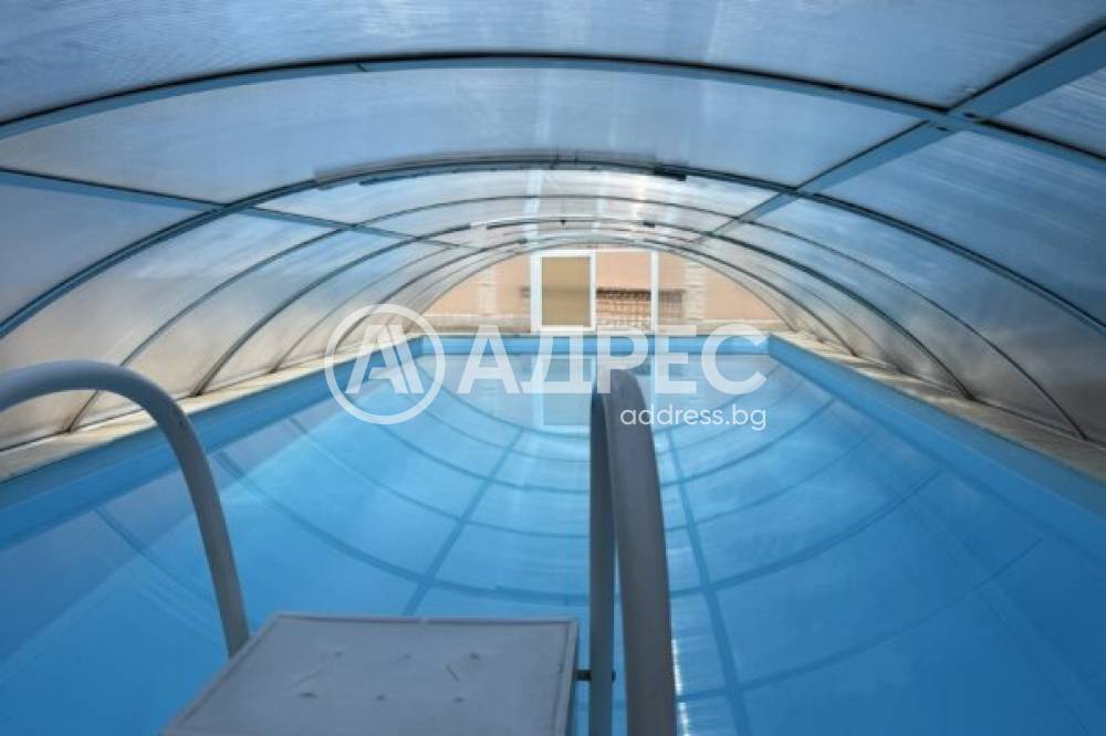 Собствен парцел с площ от 450 кв.м. Отлично поддържана градина и покрит басейн, гараж и паркомясто в двора. СОТ.