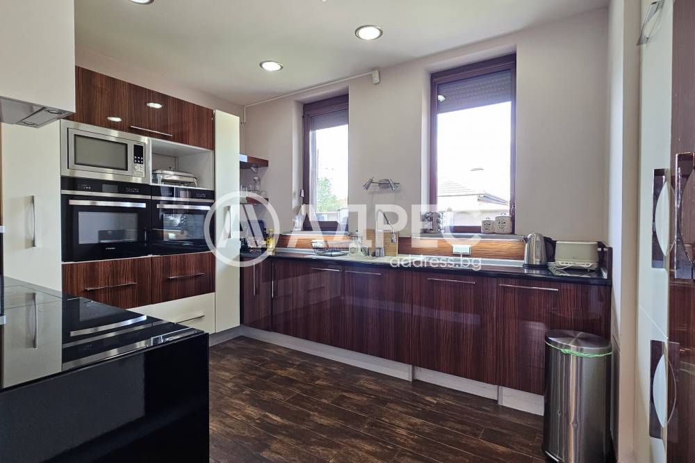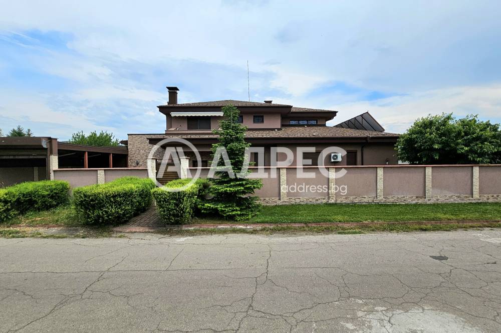 1420 кв.м. озеленен, равен двор с овощни дръвчета. Плътна ограда за пълно уединение. Поливна система със собствен водоизточник. Покрито външно барбекю с трапезария. Автоматична гаражна врата и покрит паркинг за 4 коли