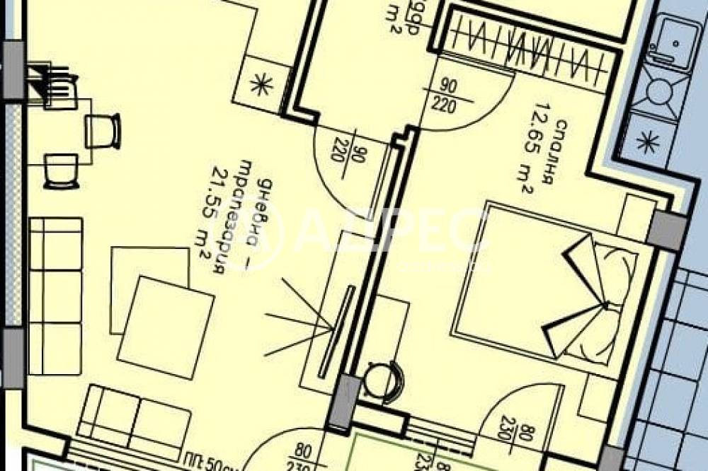 Предлагаме Ви двустаен апартамент с площ 69,49 кв.м. Жилището се състои от коридор, всекидневна с кухненски бокс с излаз на слънчева тераса и спалня, килер и мокро помещение.