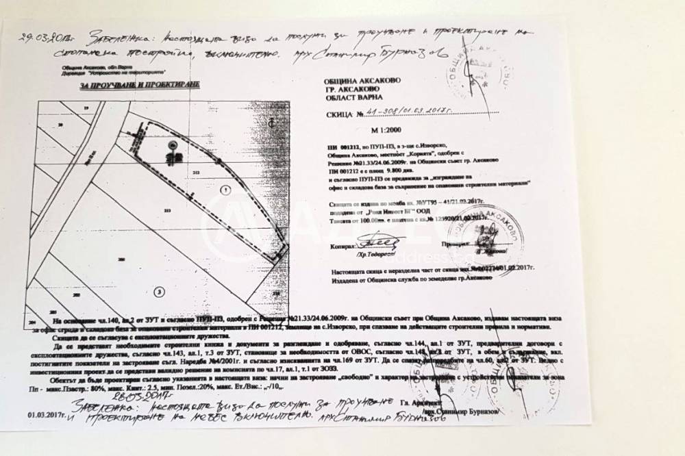 Парцелът се намира на главния път за Добрич в община Аксаково, местност "Корията", ПП - максимални параметри за застрояване: 80%, макс. Кинт.:2,5, мин,Озеленяване:20% макс Ет./Вис.: -/10. Лице на главен път. Общо разгърната застроена площ 24000 кв.м, има и всички необходими документи за изграждане на складова или производствена база. Има съгласуван с МВР ускорителен път и трасировка на вход - изход за тирове. Всички видове съгласувания и разрешения - готов за изграждане на производствено - складова база.