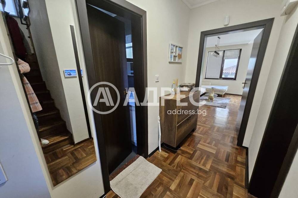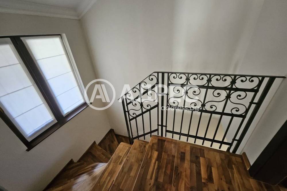 - на втори етаж две спални всяка със самостоятелен възел. Тавански етаж. Къщата е напълно обзаведена с поръчкови мебели, дървена дограма и естествен паркет от орех. Уредите са най-висок клас! Изложение юг - изток - запад.