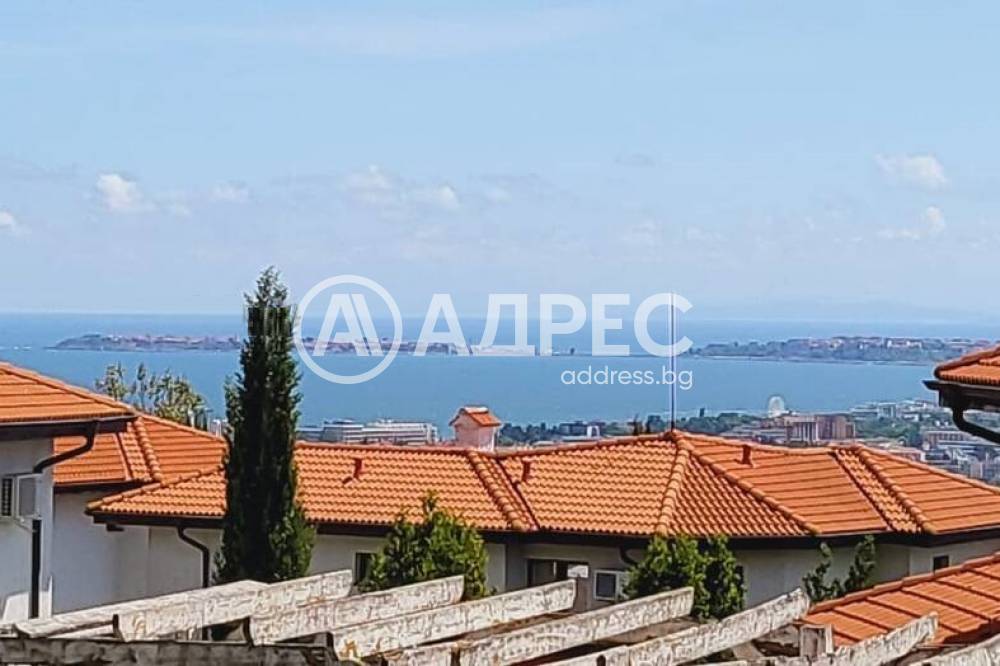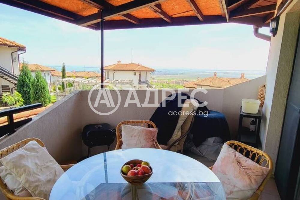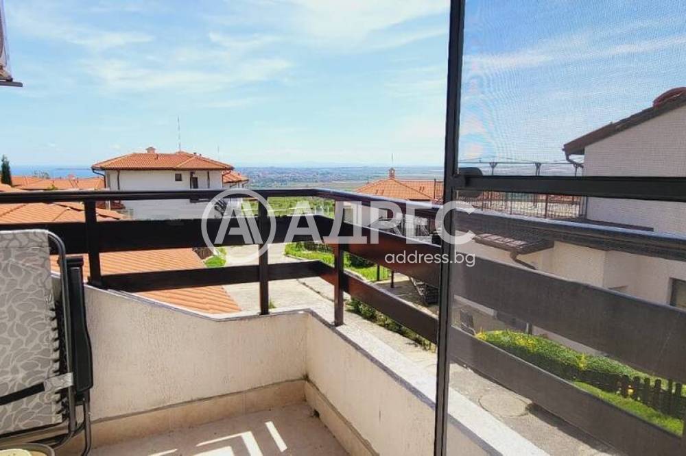 Къща с южно изложение в комплекс с три басейна, фитнес център, бар басеин, ресторант, магазин. Състои се от хол с голяма тераса с прекрасна морска гледка, голяма кухня с кът за хранене, спалня с балкон с вид на море, отделно тоалетна и баня и помещение годно за кабинет или гардеробна или за преспиване на гости. Кухнята напълно оборудвана: голям хладилник, котлони, фурна, съдомиялна, пералня. Спалня с голям гардероб, Хол с диван и електрическа камина. Два климатика и камина перфектно се справят през зимния сезон. Всичко е в идеално състояние и е готово за нанасяне веднага както и за отдаване под наем целогодишно и/или сезонно.