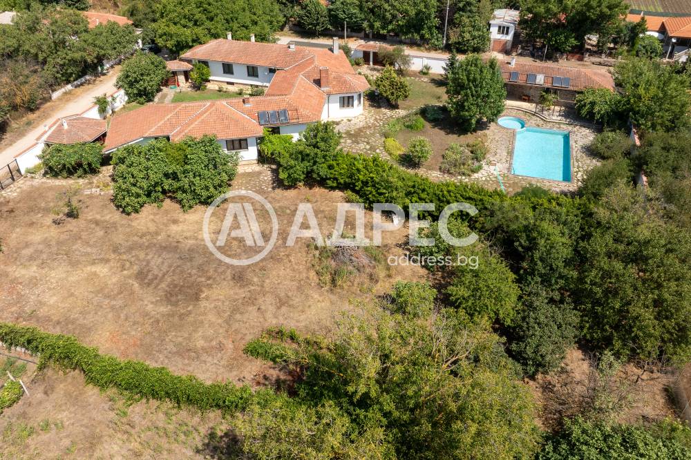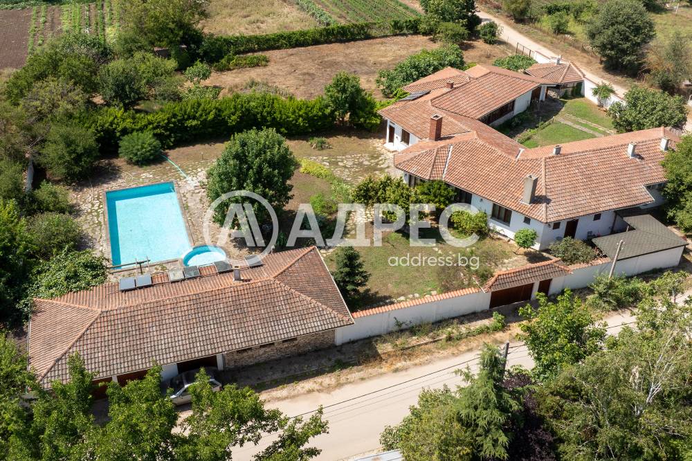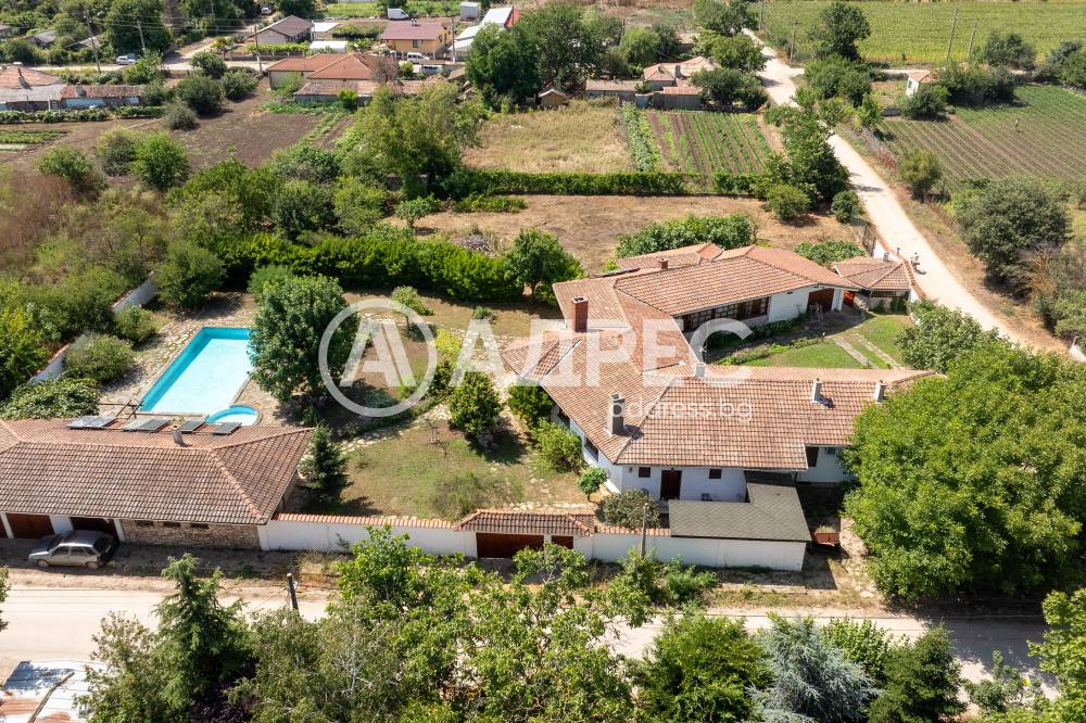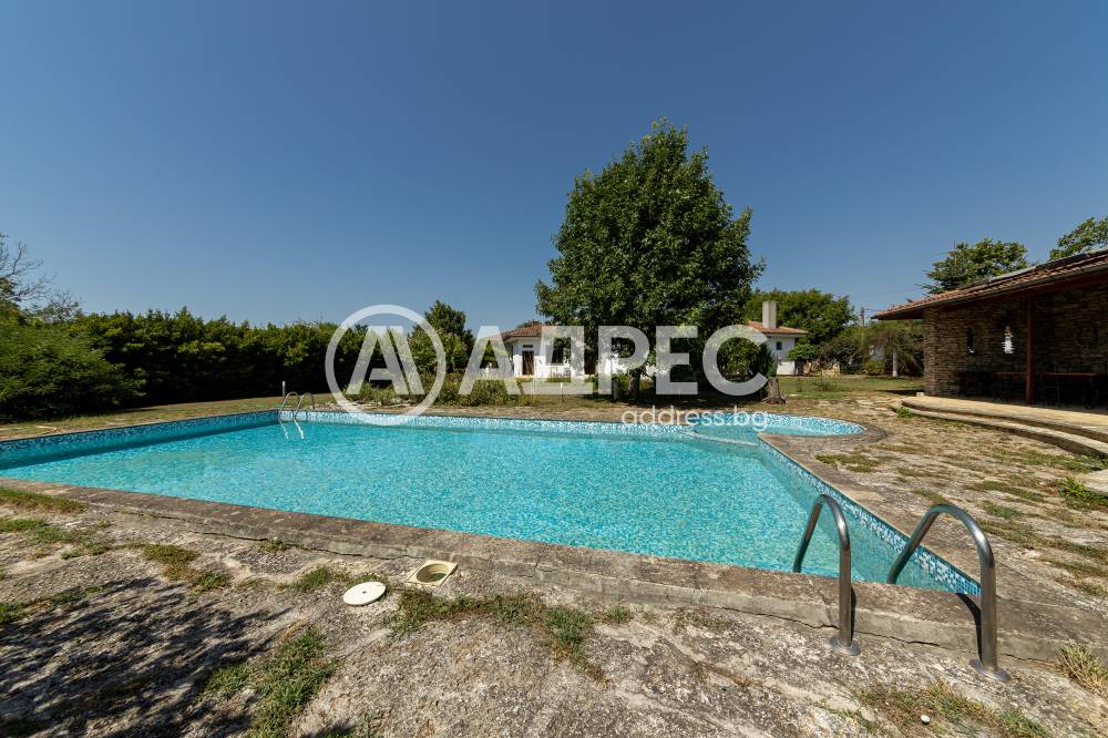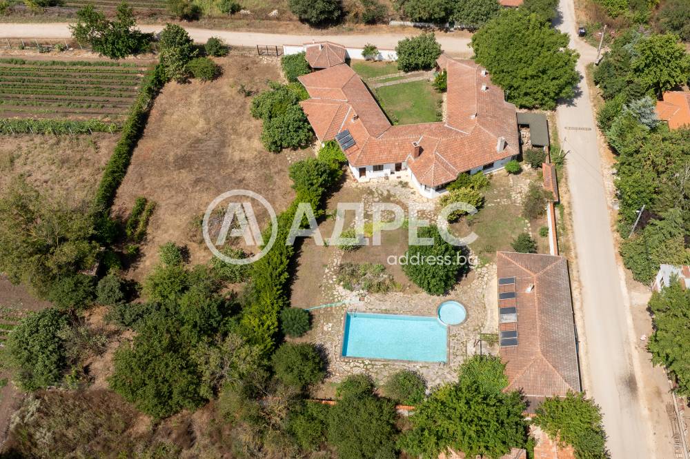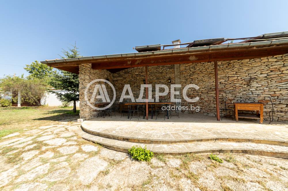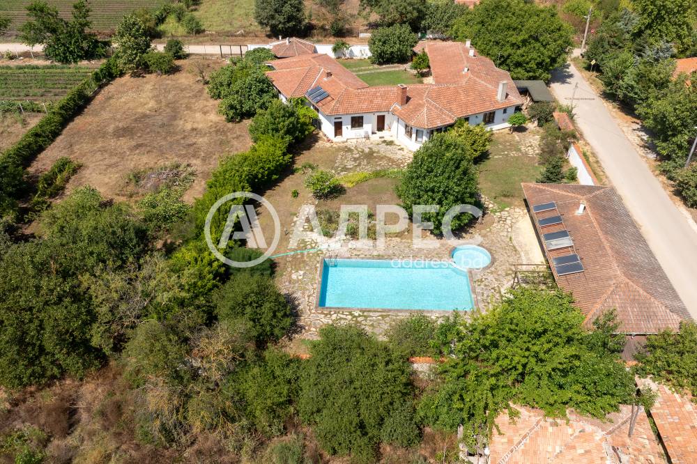 Втора сграда – изградена изцяло от ръчно дялан камък, включва: една стая с баня, три гаража, просторен навес с изглед към басейна – използваем целогодишно, масивна лятна кухня (20 кв.м) с каменна декорация – отделна от основната сграда