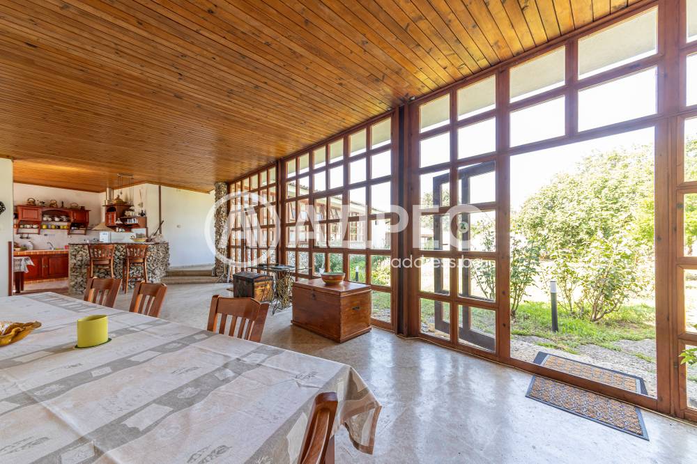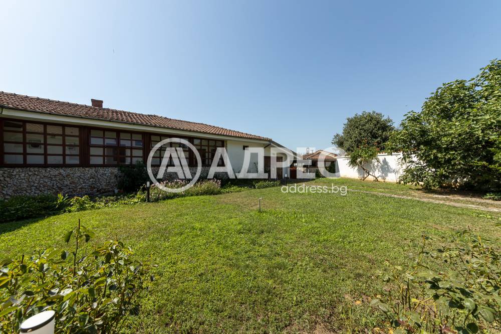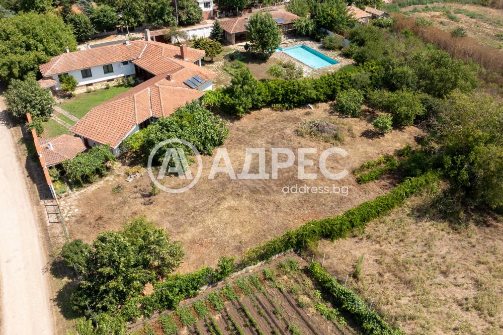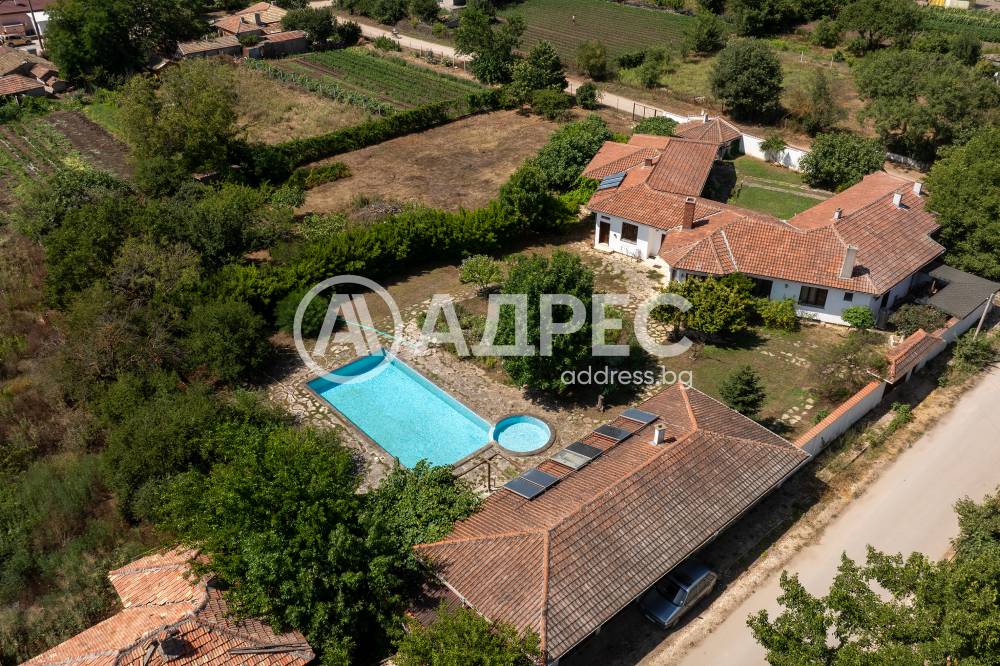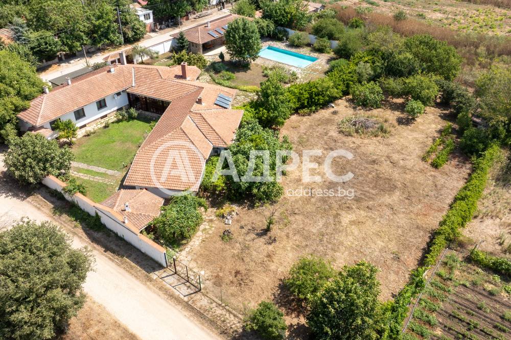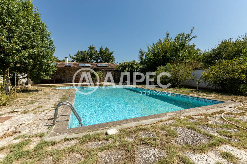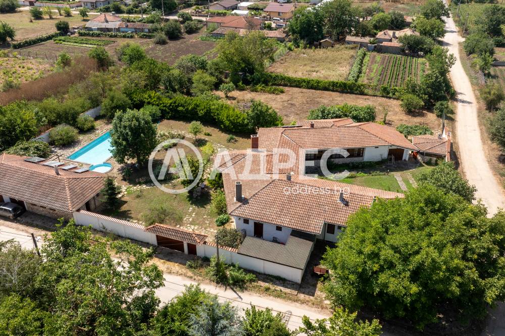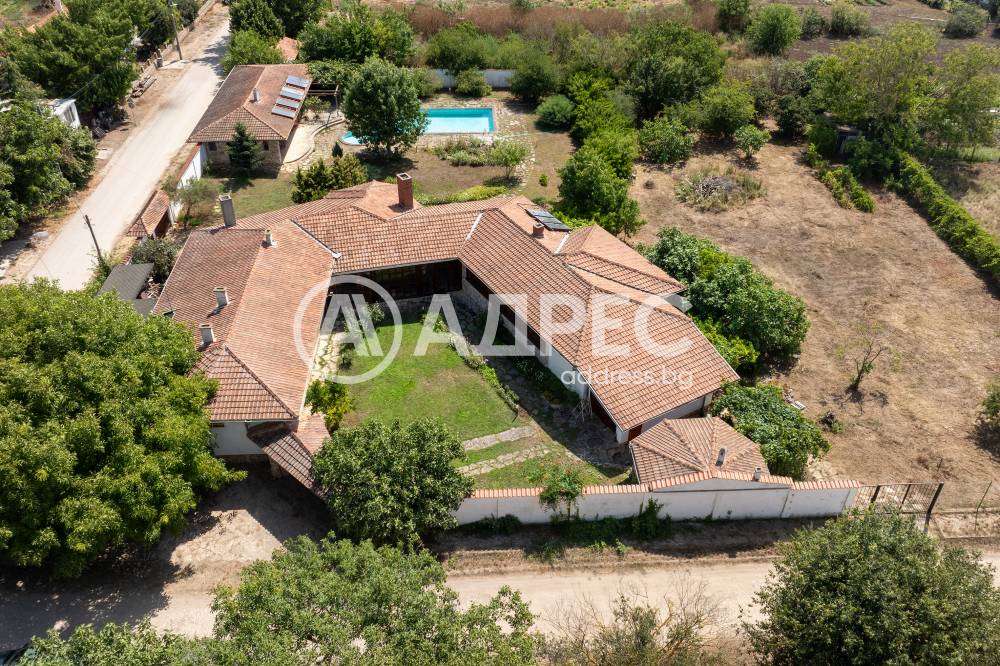 Втора сграда – изградена изцяло от ръчно дялан камък, включва: една стая с баня, три гаража, просторен навес с изглед към басейна – използваем целогодишно, масивна лятна кухня (20 кв.м) с каменна декорация – отделна от основната сграда