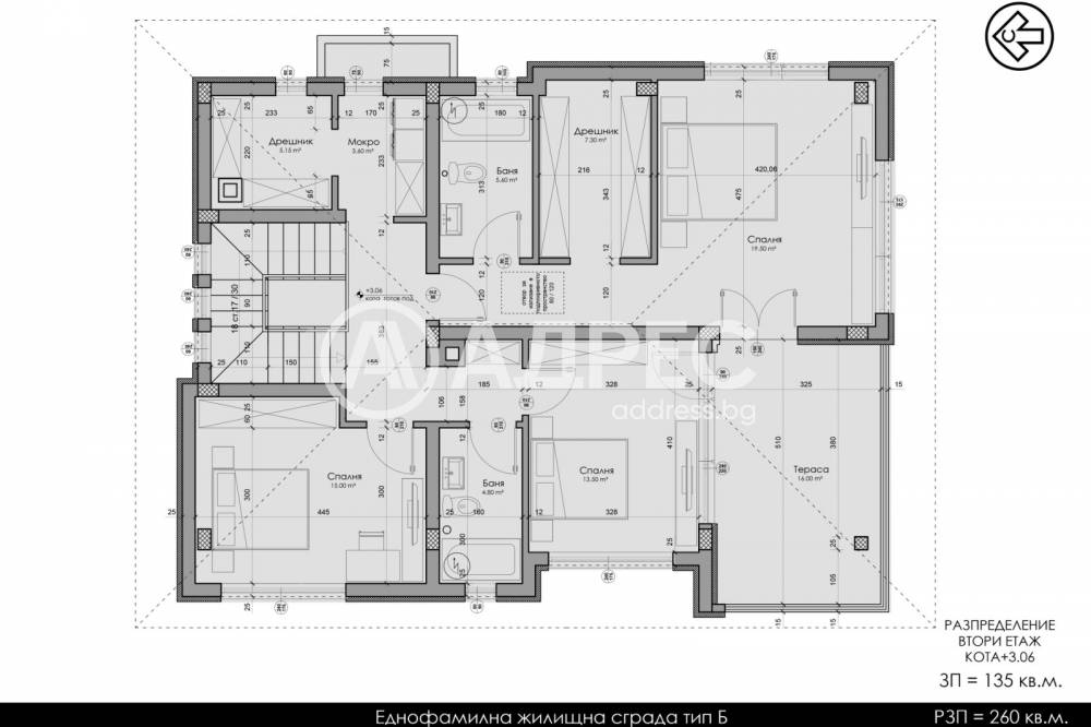 Еднофамилна двуетажна КЪЩА с гараж на 1 км от Стара Загора. Имотът е с южно изложение и прекрасна панорама, на два етажа с площ 260 кв. метра. На първи етаж са разположени просторна всекидневна (54 кв. м), баня с тоалетна, склад, техническо помещение, покрита тераса. Вторият етаж е разпределен между три просторни спални, самостоятелен дрешник, дрешник с мокро, две бани с тоалетни и южна тераса. Къщата е ситуирана, съобразена и изградена спрямо дворното място от 816 кв. м, ориентирано изцяло на юг. Облицовка с естествен камък- Травертин. Вертикална планировка: бетонни огради и площадки. Дворът е засипан с хумус и заравнен, аранжиран и озеленен, с изградена поливна система.