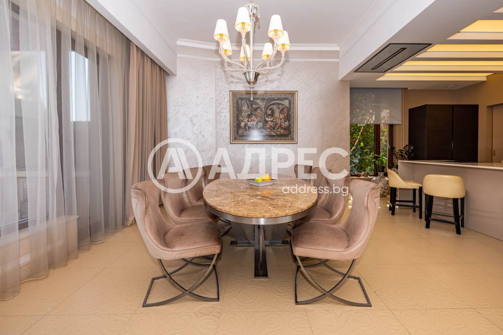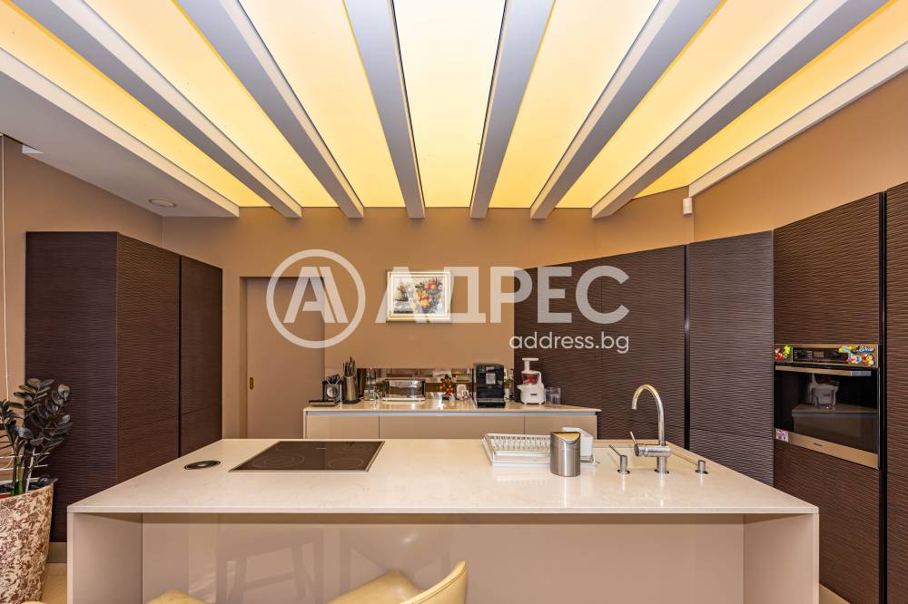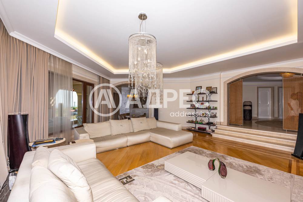 - просторна и светла дневна с обособени две зони с малка разлика в нивата- кухня с трапезария в ниската част и зона за релакс пред камината и пред телевизора. Мебелите са малко, но внимателно селектирани- свободно стояща композиция от дивани- Fabio na FENDI, килими и ниски маси на същата марка и кристални полилеи Venezia на NOIR.