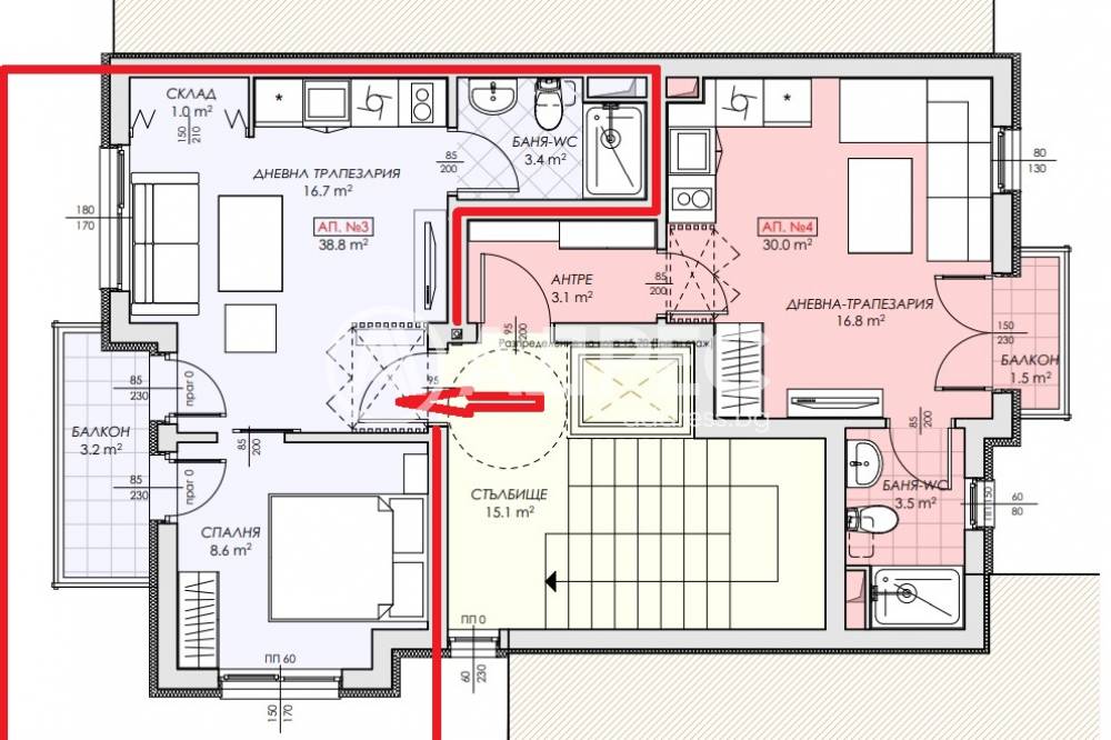 Площ на имота 53,03 кв. м., етаж 3 от 4. Състои се от дневна с кухненски кът и спалня с обща тераса, баня с тоалетна. Ще бъде завършен ДО КЛЮЧ - май 2026 г.