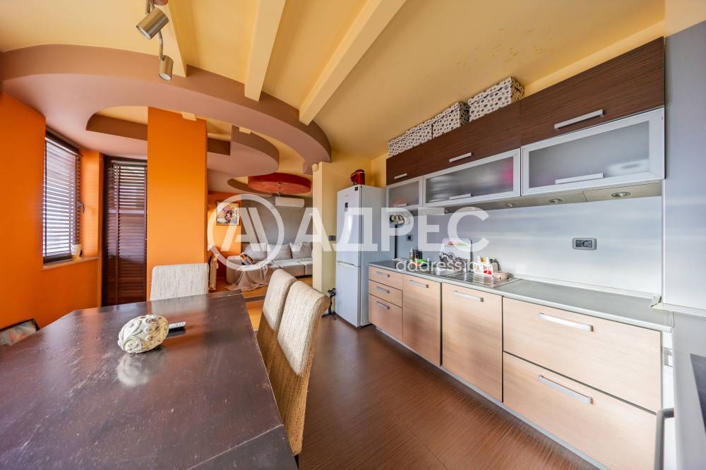 Просторна и светла дневна зона, умело комбинирана с кухня и трапезария – напълно обзаведени и оборудвани.