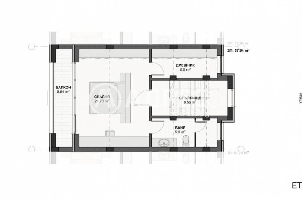 Трети етаж - спалня, дрешник, санитарно помещение и балкон.