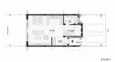 Първи етаж - антре, кухна с дневна , санитарно помещение, стълбище.