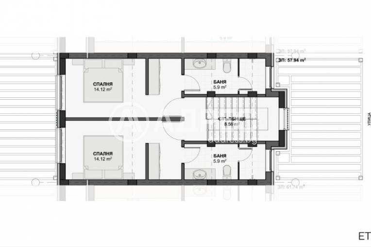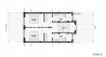 Втори етаж - две спални, две санитарни помещения, стълбище.