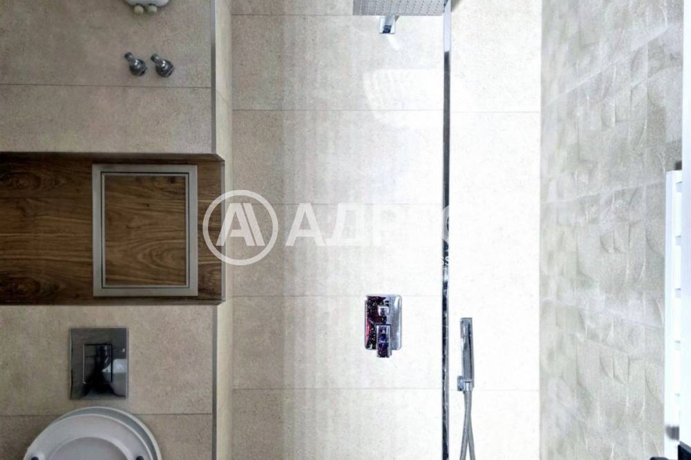 Баня с тоалетна – италиански плочки, вграден душ и структура GROHE, отопляемо огледало, PVC шкаф, водомери, проточен бойлер 8 kW.