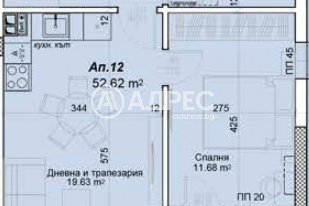 Представяме на вниманието Ви двустаен апартамент, ситуиран на първи жилищен / над партерен / етаж. Жилището разполага с просторно входно антре, складово помещение, хол с кухненска част, спалня, санитарен възел и лоджия!