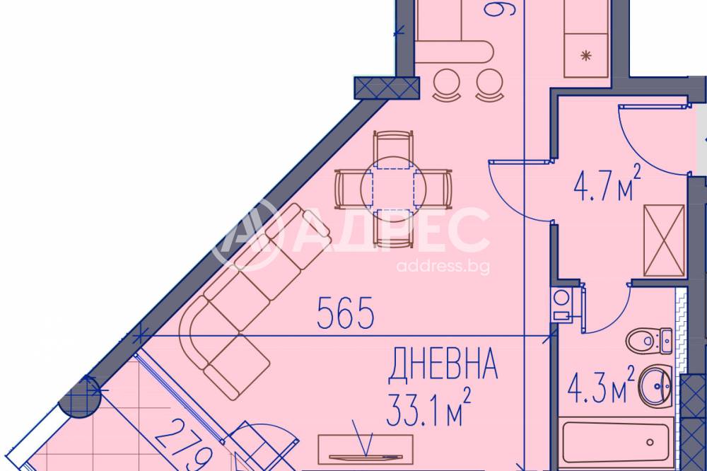 Двустаен апартамент, състоящ се от дневна с трапезария, спалня, баня с wc, тераса